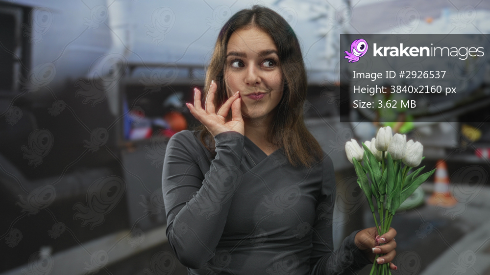 Young hispanic woman holding a bouquet of white tulips and making an ok sign beside an airplane baggage conveyor at airport; playful approval.