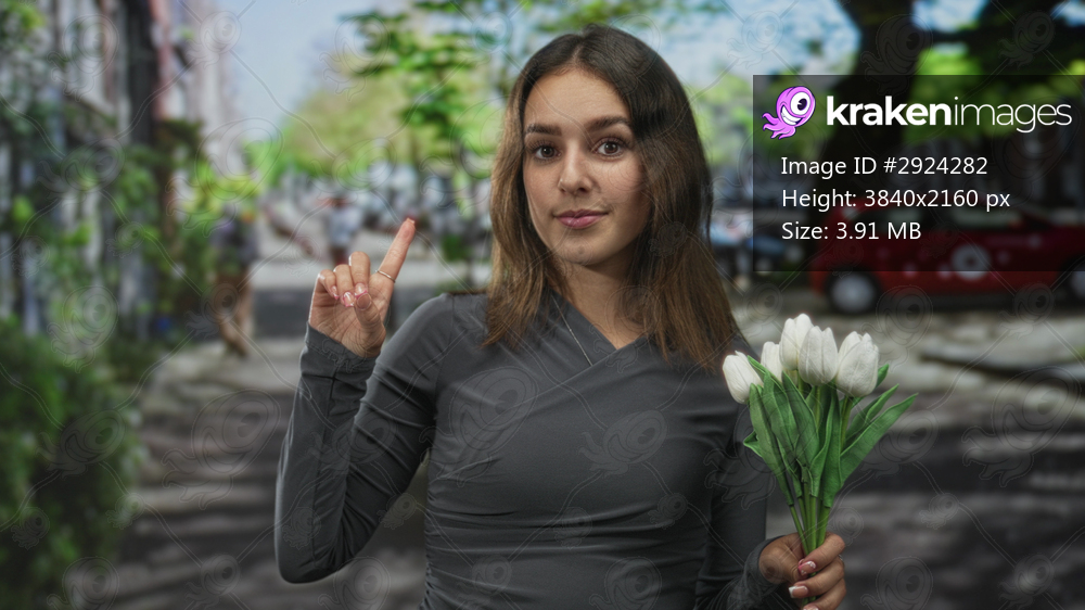 Young hispanic woman holding a bouquet of white tulips points finger toward camera on busy city street with trees and cars; hopeful greeting.