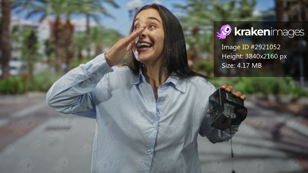Young hispanic woman holding a camera cups her hand to her mouth on a sunny street lined with palm trees and shops; excitement spontaneous moment.