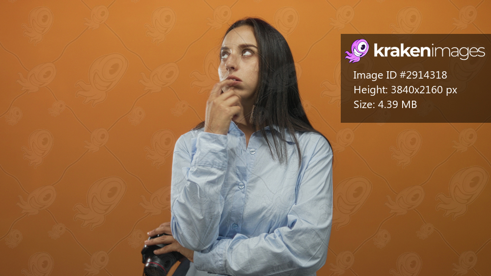 Young hispanic woman holding a camera and showing finger to lips with raised hand in orange studio; quiet thinking curiosity.