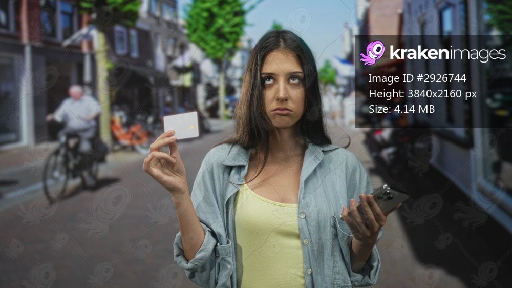 Young hispanic woman holding a creditcard and smartphone on a city street, rolling eyes and shrugging with palm up; frustration.