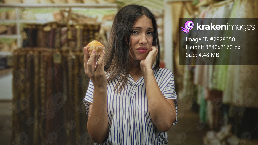 Young hispanic woman holding a cupcake with hand on cheek for toothache in a building clothing shop; toothache discomfort.