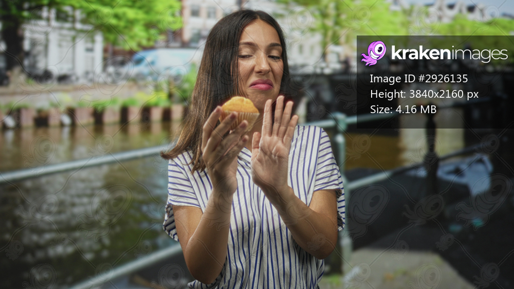 Young hispanic woman holding a cupcake with hands pushing it away on a street in amsterdam; disgust rejection.