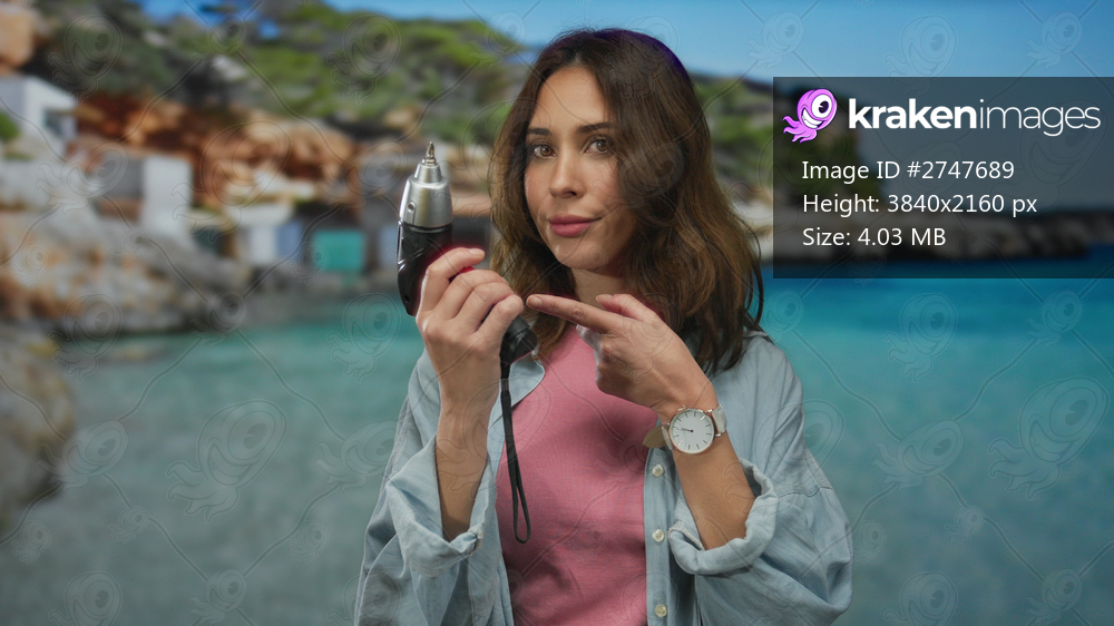 Young hispanic woman holding a drill at a seaside location with the beach and sea in the background, showcasing outdoor tool usage with confidence and style. - Kraken Images
