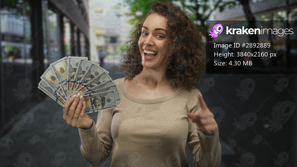 Young hispanic woman holding a fan of cash points finger to money on street while smiling; confidence.