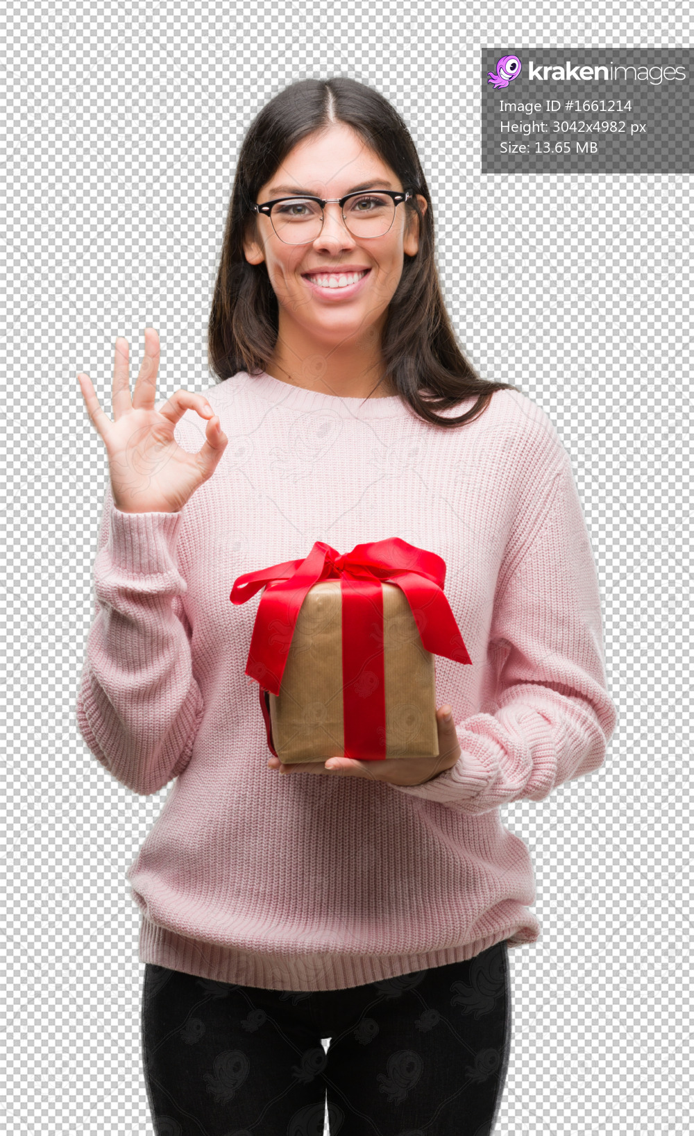 Young hispanic woman holding a gift doing ok sign with fingers, excellent symbol
