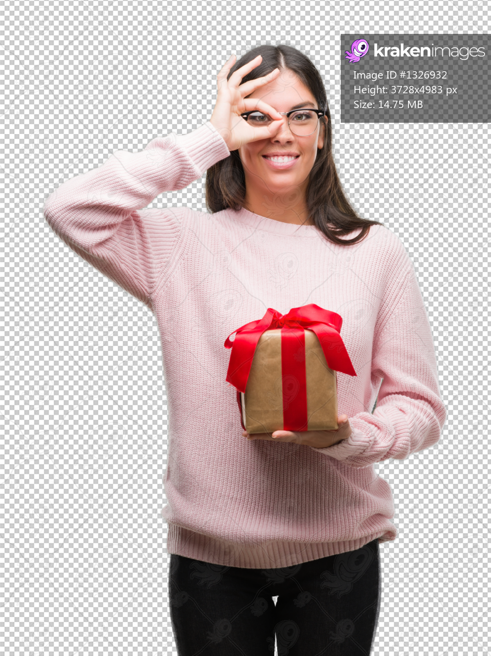 Young hispanic woman holding a gift with happy face smiling doing ok sign with hand on eye looking through fingers