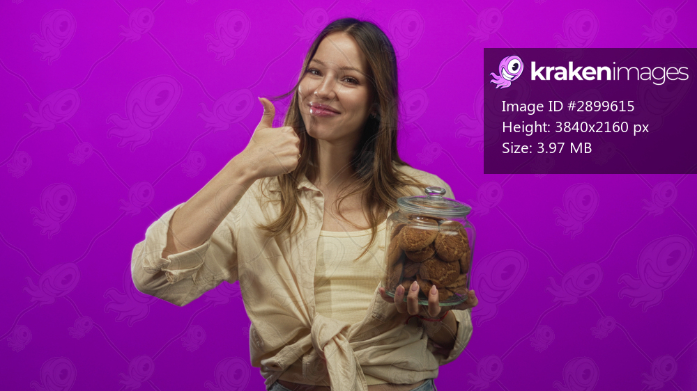 Young hispanic woman holding a jar of cookies and pointing finger to jar in studio with magenta backdrop; playful joy.
