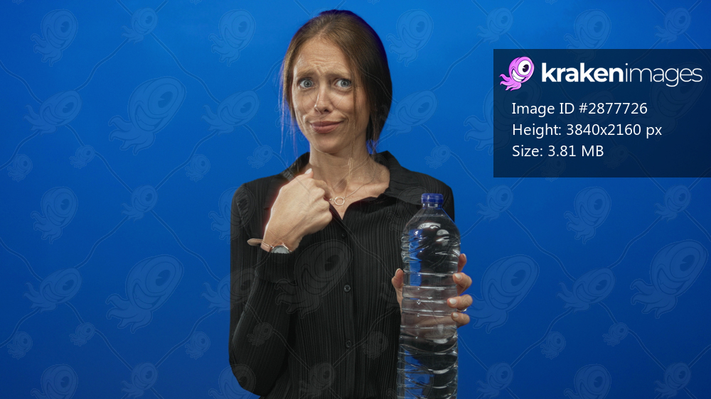 Young hispanic woman holding a large water bottle and pointing one finger while showing bare hand and necklace in studio with blue backdrop; skepticism. - Kraken Images