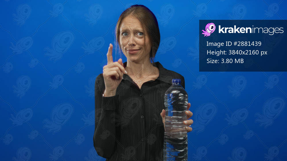 Young hispanic woman holding a large water bottle and pointing one finger while showing bare hand and necklace in studio with blue backdrop; skepticism. - Kraken Images