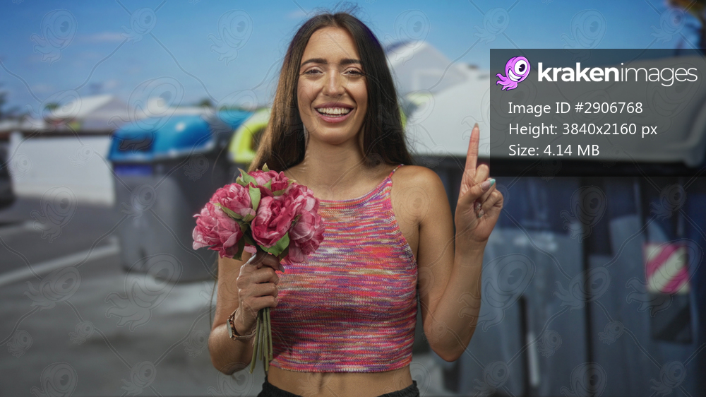 Young hispanic woman holding a pink bouquet with index finger raised beside recycling containers and trash bins on a sunny urban street; optimism.