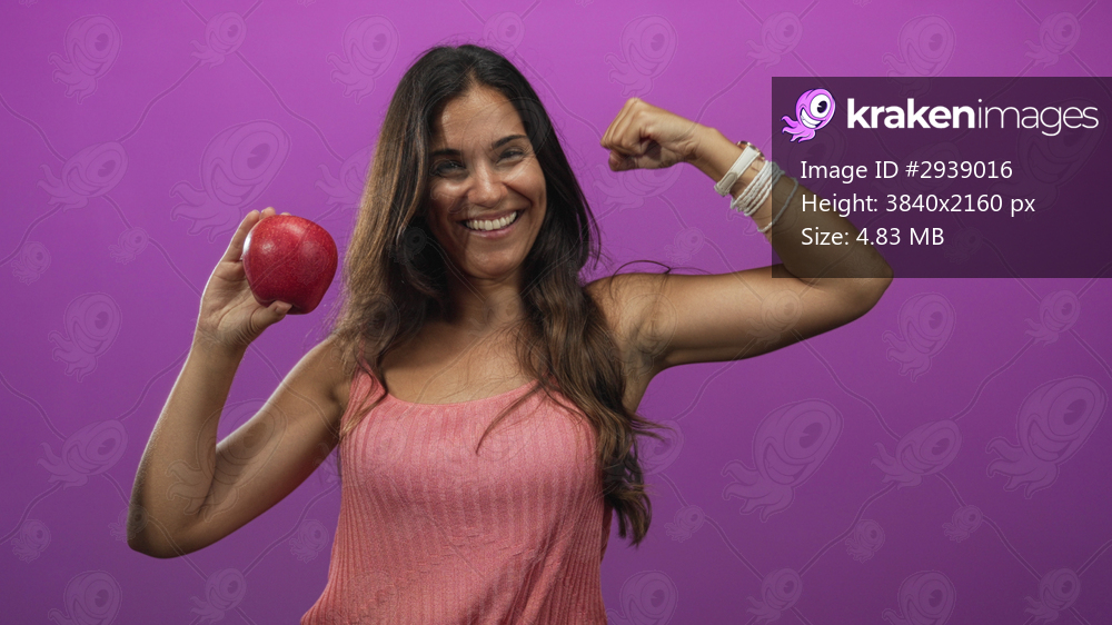 Young hispanic woman holding a red apple and flexing her arm in a purple studio; confidence health empowerment and vitality.