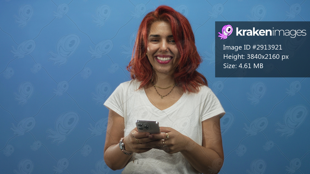 Young hispanic woman holding a smartphone and smiling in a blue studio setting wearing a white t shirt; joy connection.