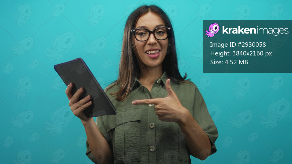 Young hispanic woman holding a tablet and pointing finger while smiling in studio with turquoise backdrop and casual shirt; confidence curiosity.