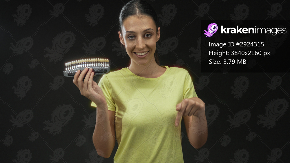 Young hispanic woman holding a tooth shade guide, smiling and pointing finger toward swatches in studio with black backdrop; confidence dental care.