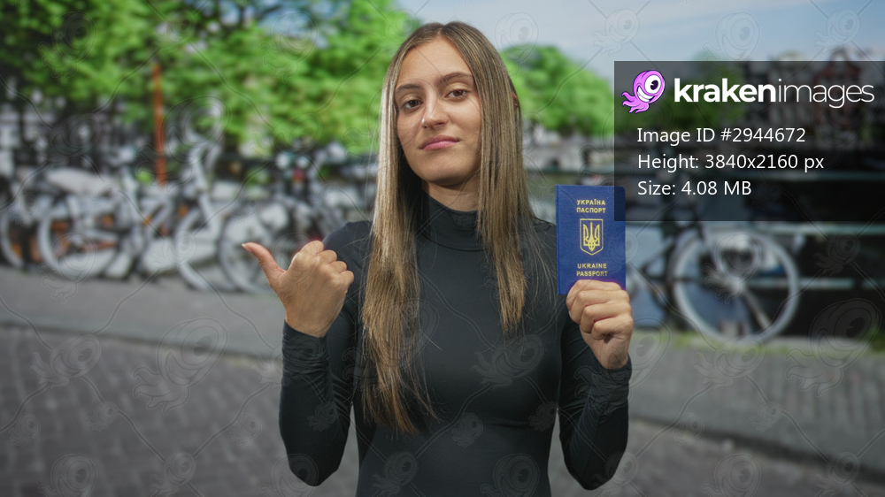 Young hispanic woman holding a ukrainian passport and pointing her thumb over shoulder on a canal street; travel doubt.