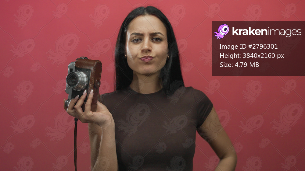 Young hispanic woman holding a vintage camera, gesturing no with her finger against an isolated red background wall, conveying disapproval or frustration. - Kraken Images
