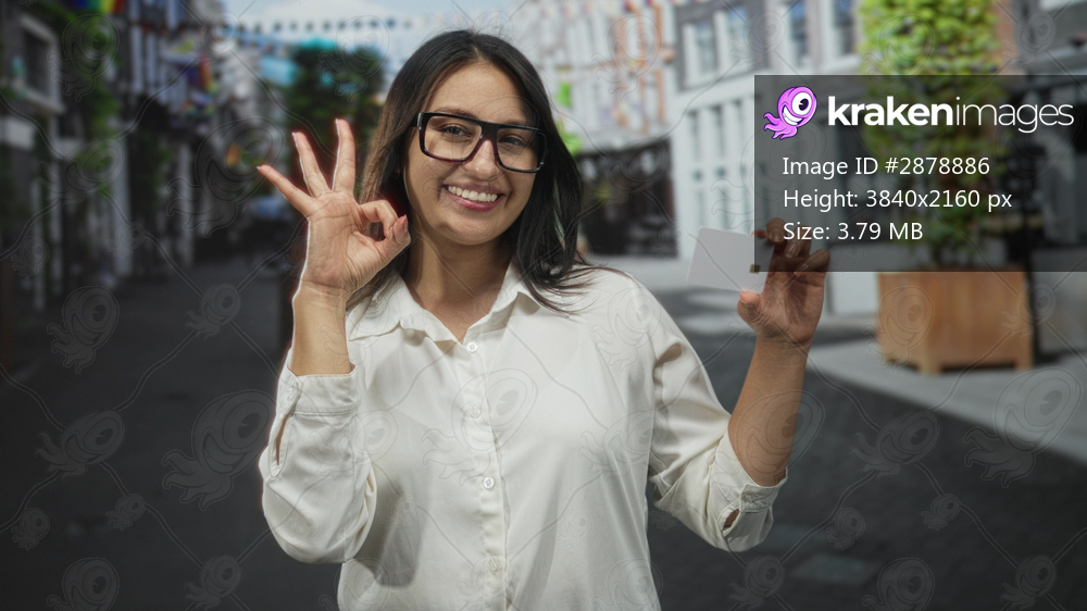 Young hispanic woman holding a white card and making ok sign near her face on a city street while smiling and wearing glasses; confidence.