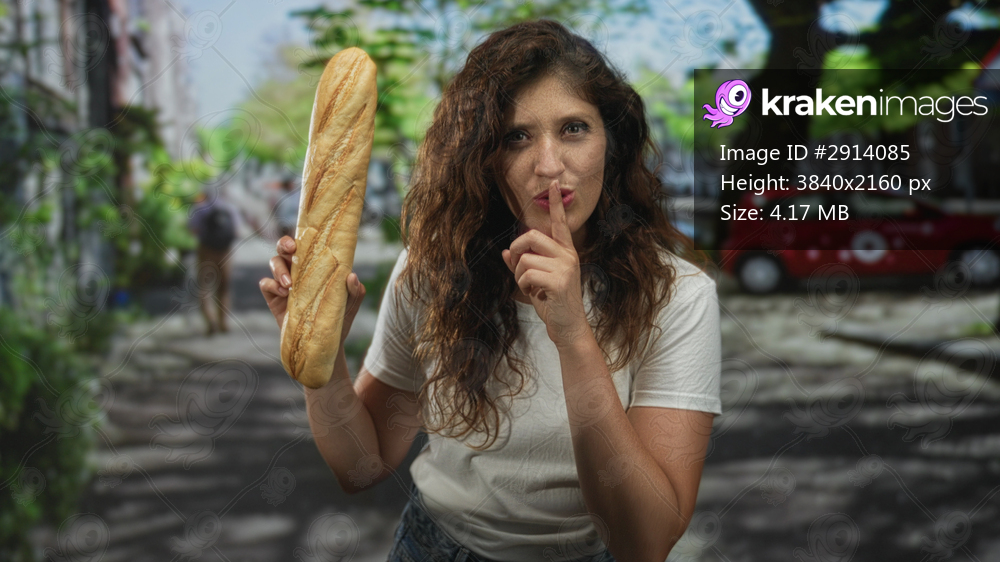 Young hispanic woman holding baguette with finger to lips for silence on city street; secret mischief.
