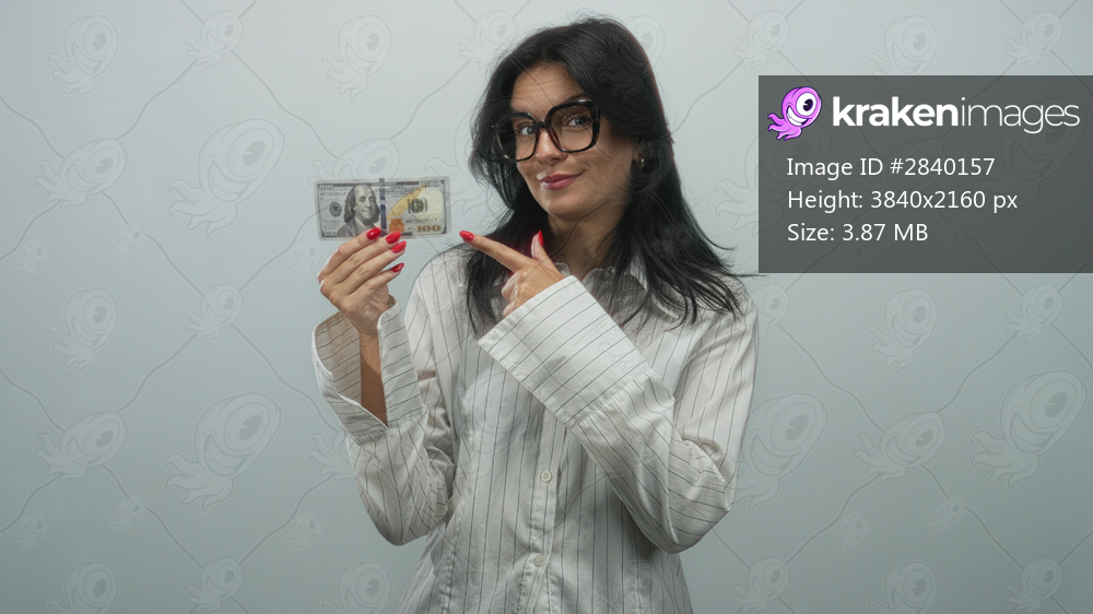 Young hispanic woman holding banknote wearing glasses in bright grey studio setting; confidence prosperity wealth.