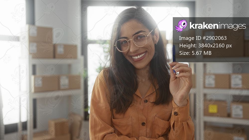Young hispanic woman holding blue pen to cheek among stacked parcel boxes in small office building; thoughtful planning.