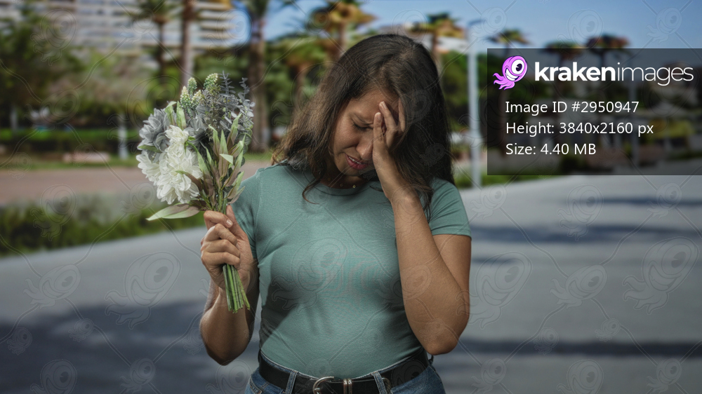 Young hispanic woman holding bouquet with hand on cheek for toothache on a sunny street promenade lined with palm trees and benches; sadness heartbreak loss. - Kraken Images