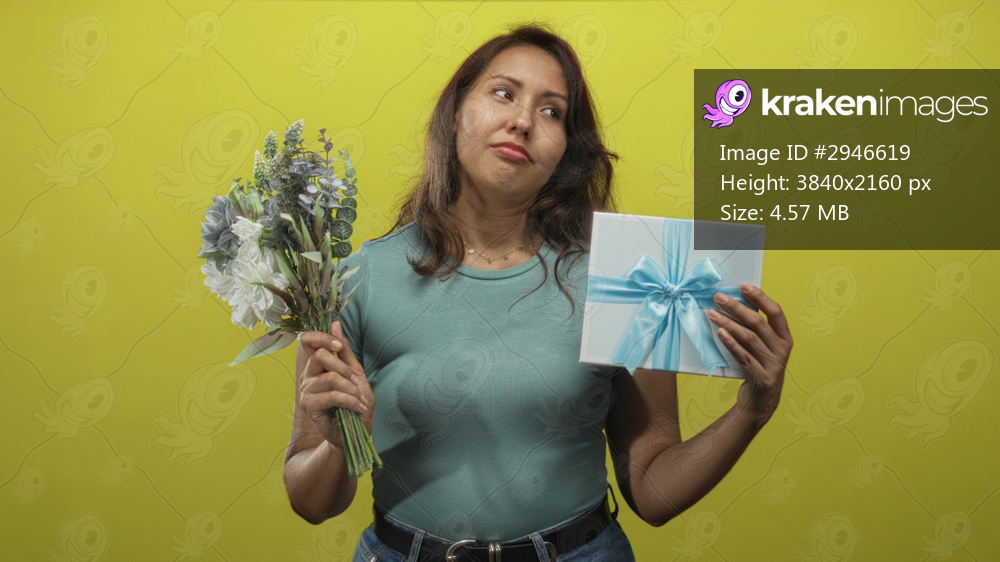 Young hispanic woman holding bouquet of flowers and blue ribbon gift box with closed eyes and slight smile in studio against yellow backdrop; joy gratitude. - Kraken Images