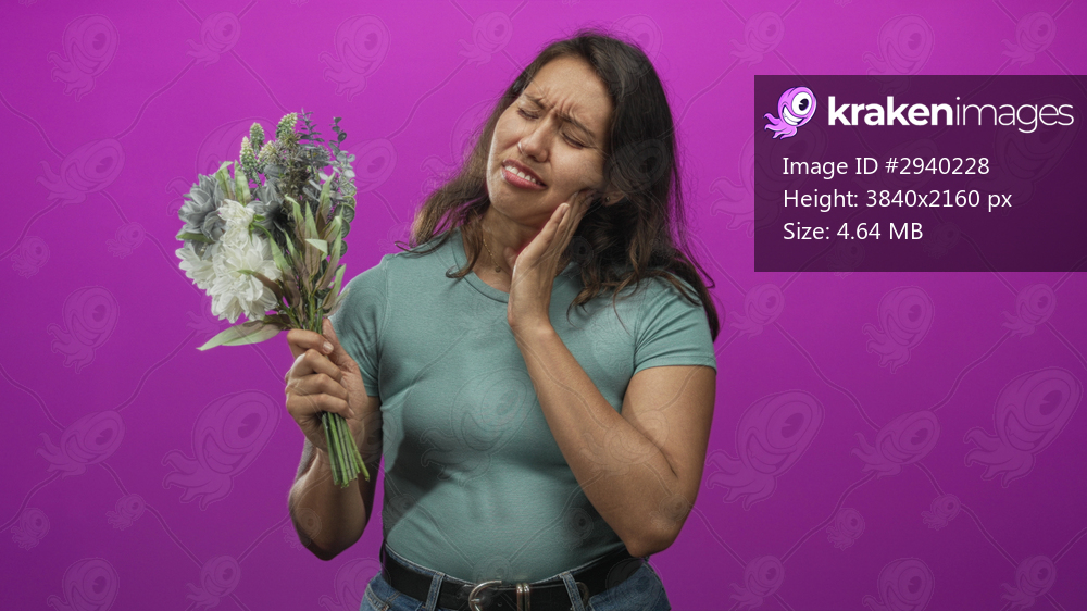 Young hispanic woman holding bouquet and pressing cheek for toothache in magenta studio; pain discomfort.