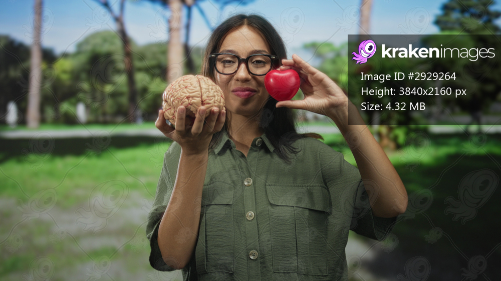 Young hispanic woman holding brain model in one hand and a red heart in the other in forest; contemplation balance.