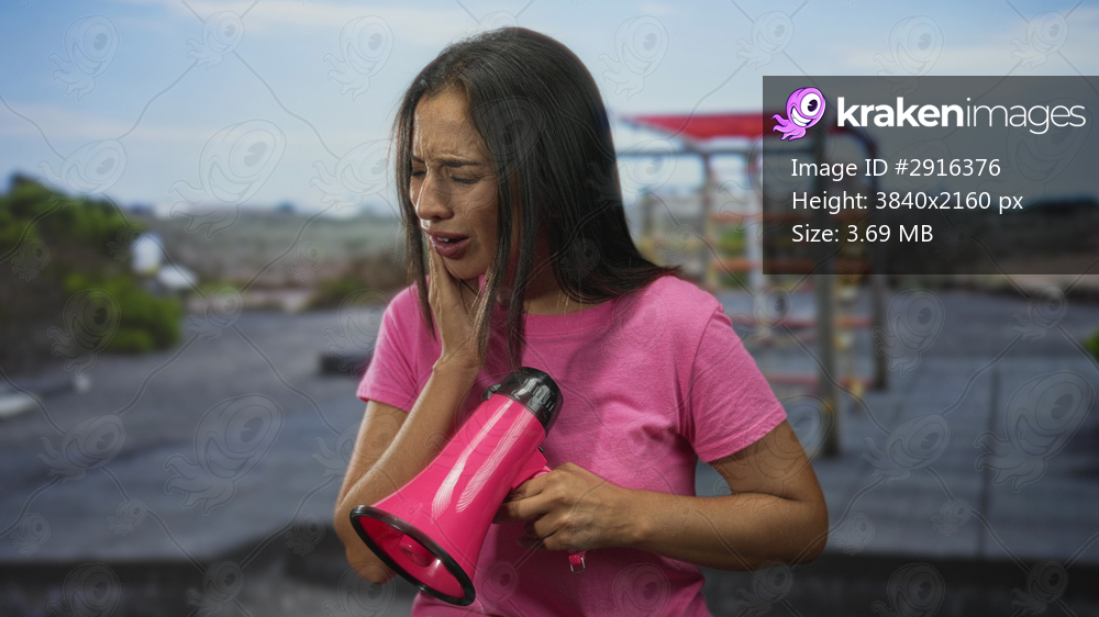 Young hispanic woman holding bright pink megaphone with hand on cheek on building rooftop at dusk; toothache pain.