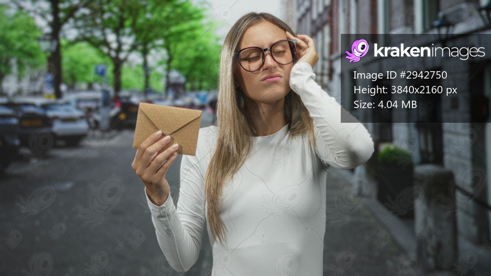 Young hispanic woman holding brown envelope, touching temple with glasses on a city street, squinting at the mail; frustration.