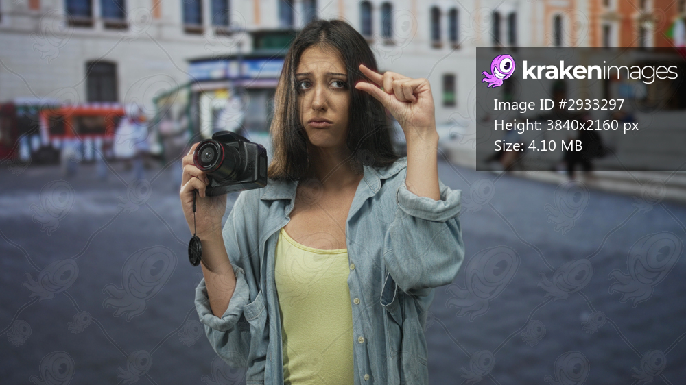 Young hispanic woman holding camera pinching fingers to show small at street; frustration travel mishap.