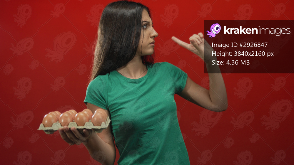 Young hispanic woman holding cardboard egg carton of brown eggs and pointing finger to the side in red studio; frustration warning.