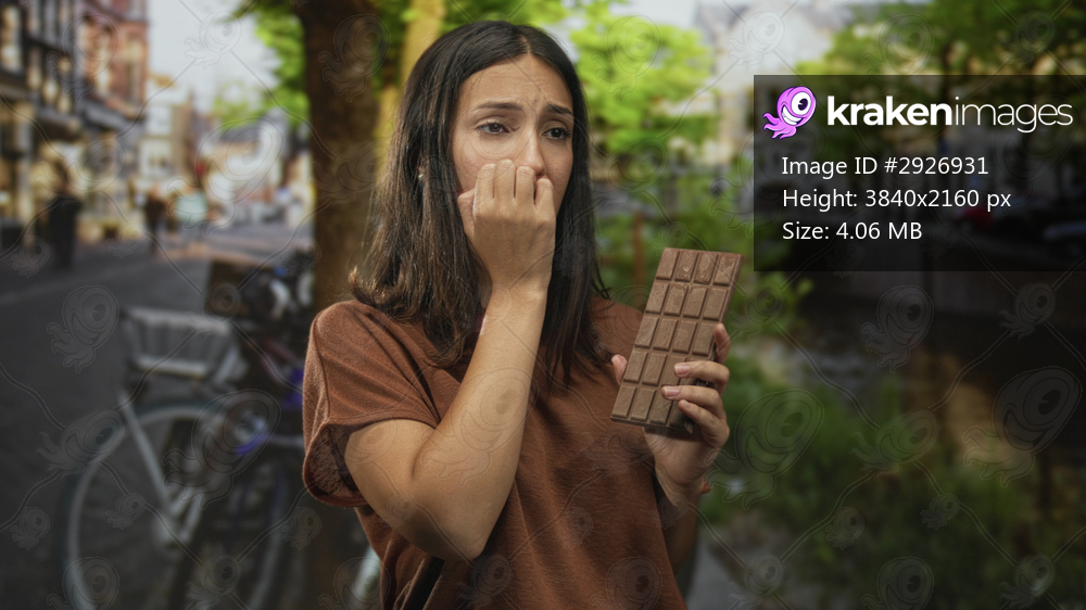 Young hispanic woman holding chocolate bar bites nails on amsterdam street; anxiety craving comfort.