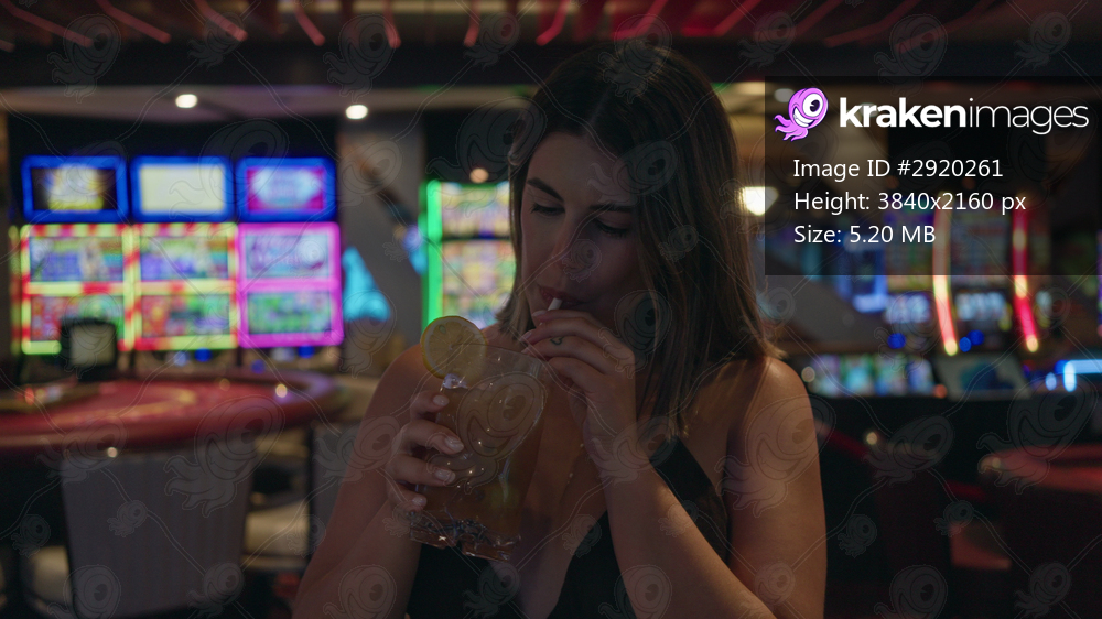 Young hispanic woman holding cocktail with lemon slice and sipping through a straw in casino gaming area; relaxation.