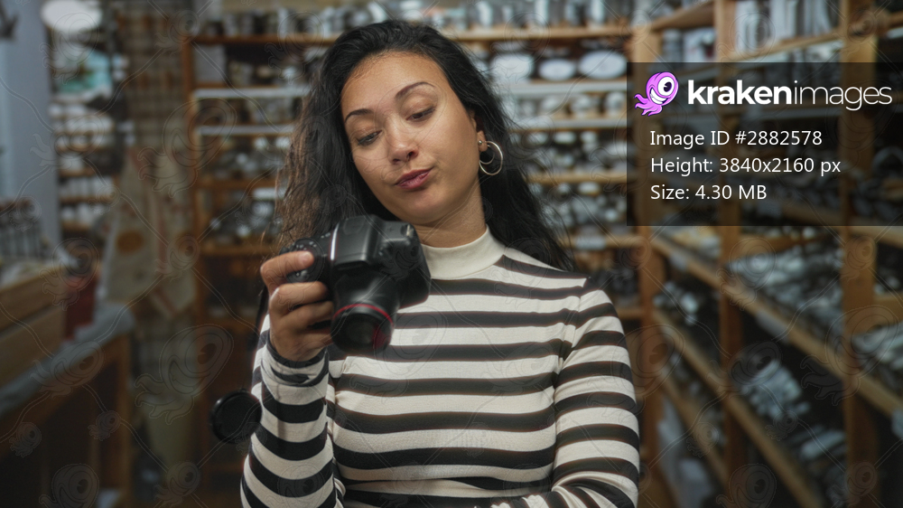 Young hispanic woman holding dslr camera and studying its screen amid shelf lined shop aisles, hands visible and focused; curiosity inspection.