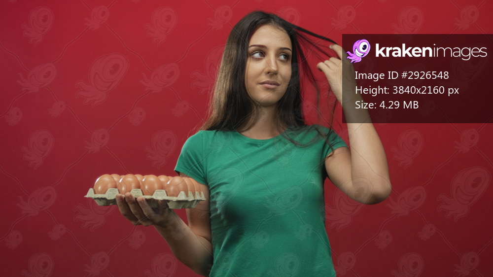Young hispanic woman holding egg carton in hand and twirling hair in red studio; thoughtful curiosity domestic.