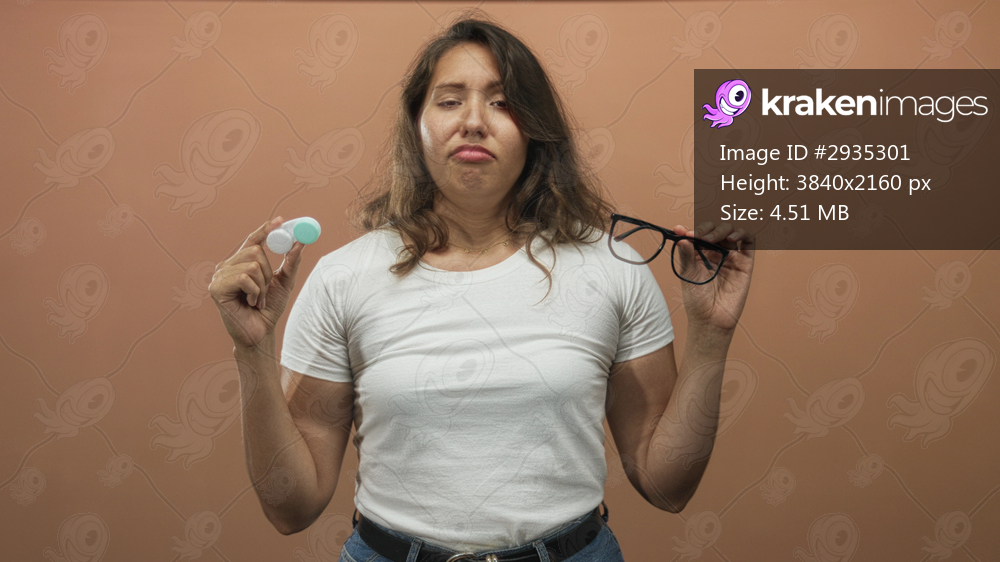 Young hispanic woman holding eyeglasses and contact lens case in peach studio with pursed lips and a puzzled look; annoyance indecision.