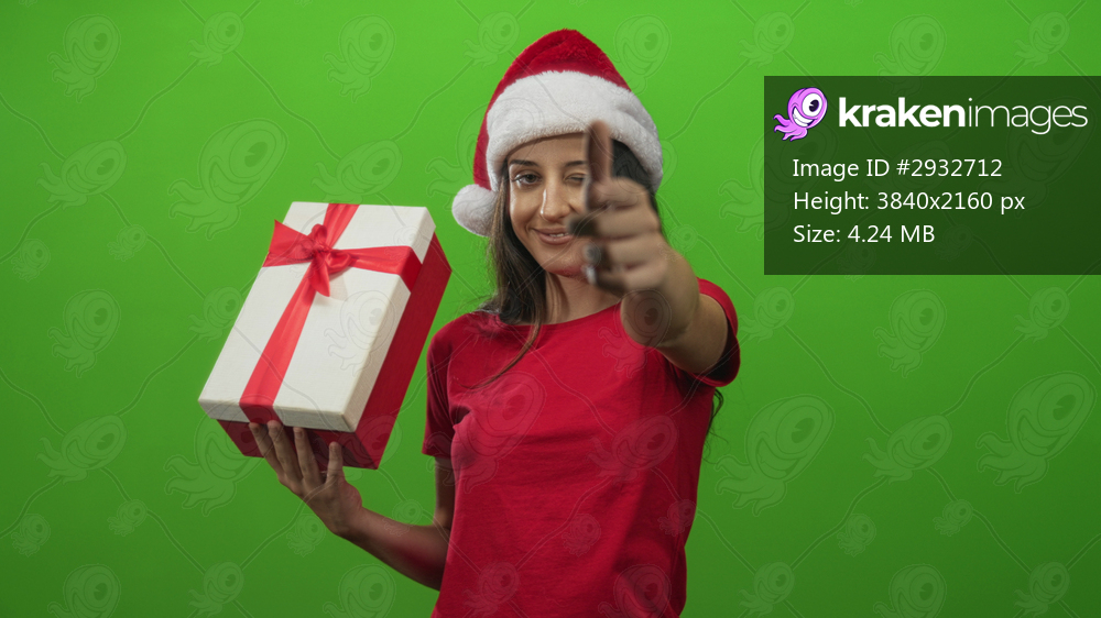 Young hispanic woman holding gift box and pointing finger while winking in green studio with santa hat; festive surprise.