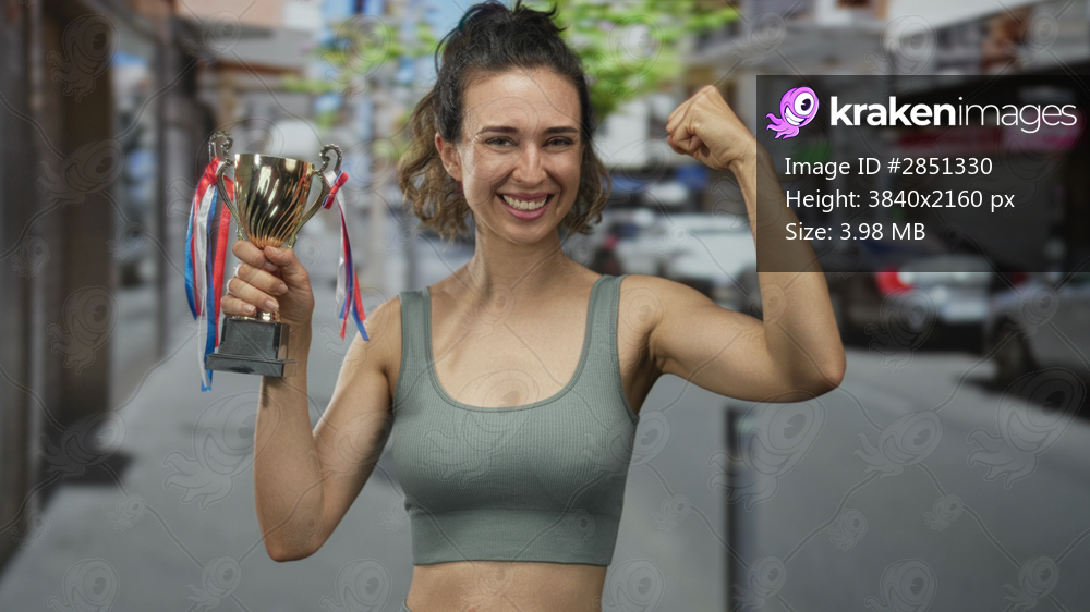 Young hispanic woman holding gold trophy lifts fist and smiles broadly in bright daylight on busy city street; victory.