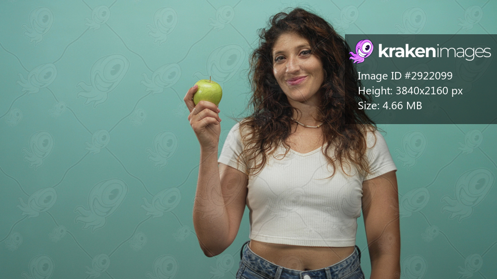 Young hispanic woman holding green apple in right hand with left hand on chest in studio teal backdrop; gratitude wellness.