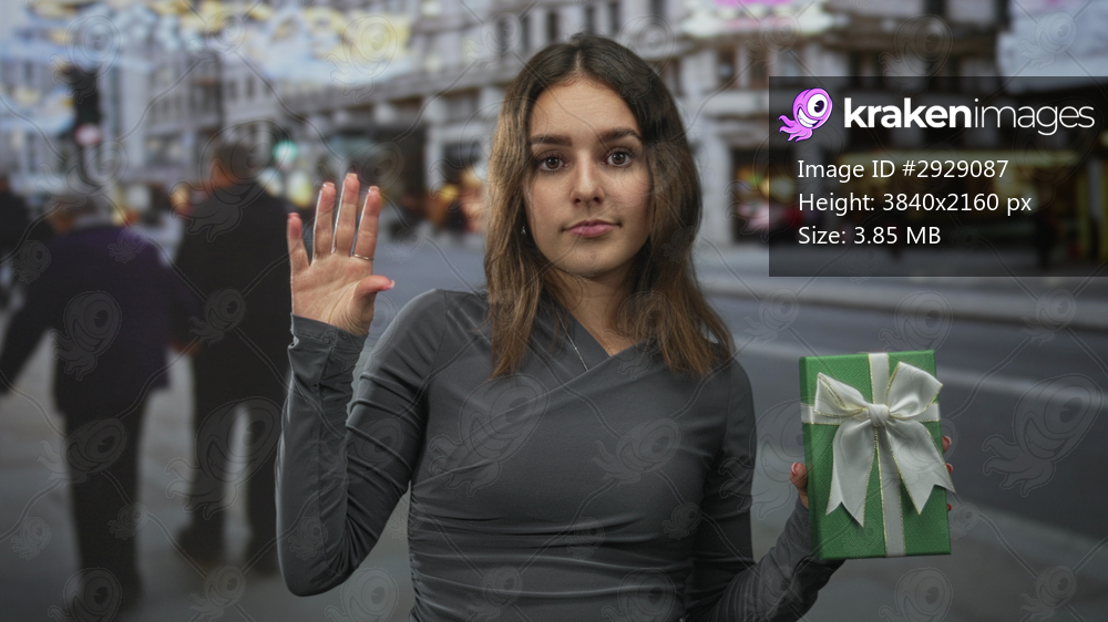 Young hispanic woman holding green gift box with white bow and hand raised palm out on city street; hesitation.