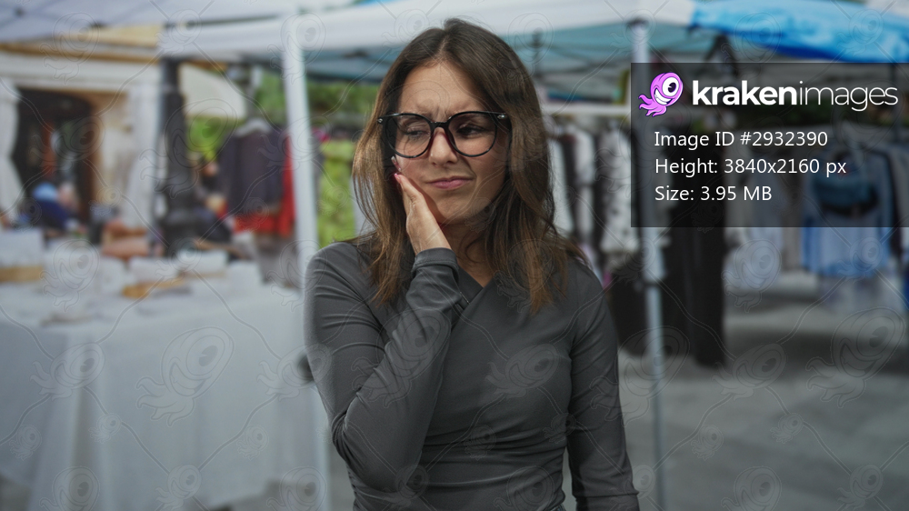 Young hispanic woman holding hand to cheek for toothache in street market amid souvenir and clothing stalls, tents and tables; toothache discomfort.
