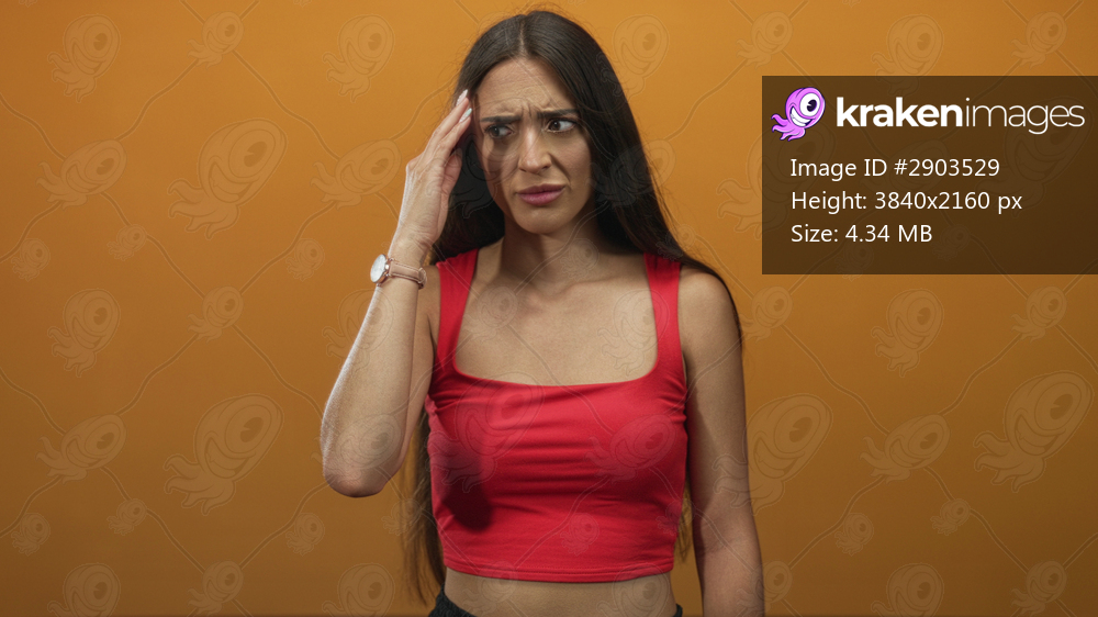 Young hispanic woman holding hand to temple in studio against orange wall wearing red crop shirt, visible wristwatch; discomfort.