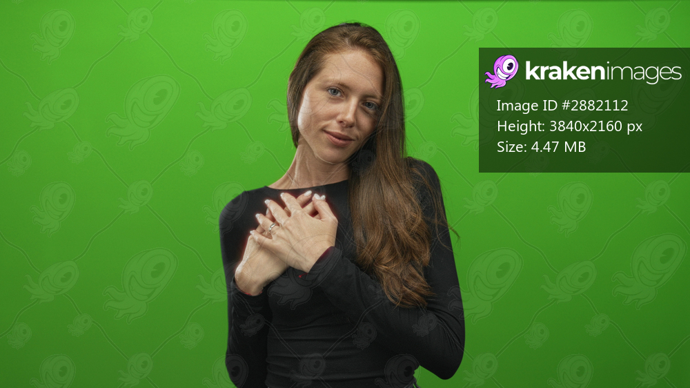 Young hispanic woman holding hands to chest with eyes closed in studio green screen wearing black top and long hair; gratitude healing.