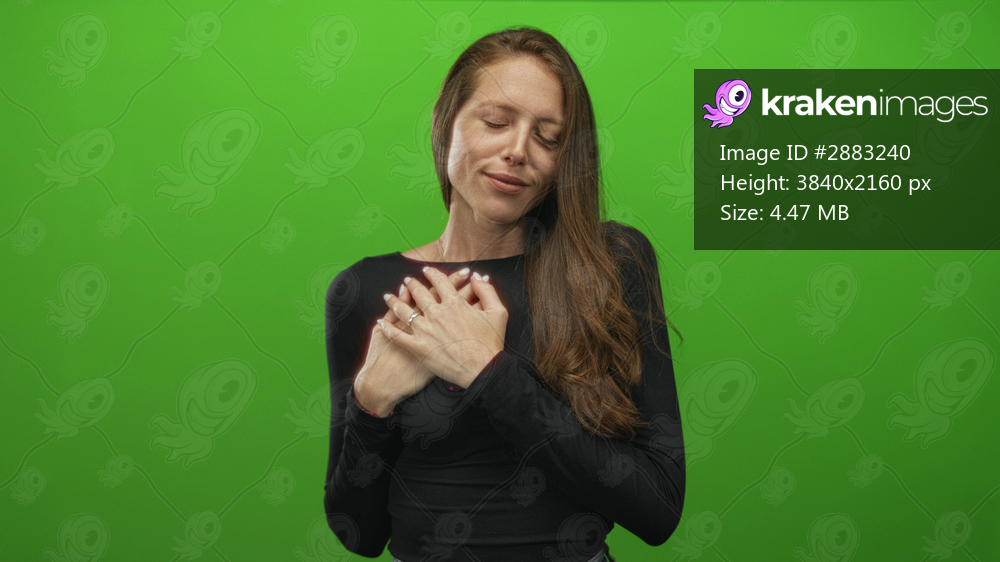 Young hispanic woman holding hands to chest with eyes closed in studio green screen wearing black top and long hair; gratitude healing.