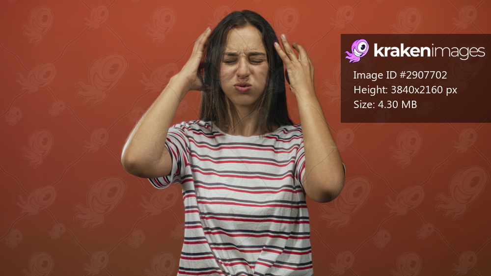 Young hispanic woman holding head and pressing temples while wearing striped shirt in orange studio; stress headache tension.