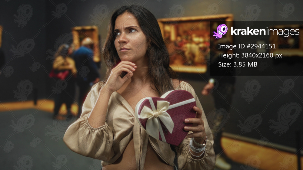 Young hispanic woman holding heart gift box with hand to head in building gallery among framed paintings and visitors; confusion doubt contemplation.
