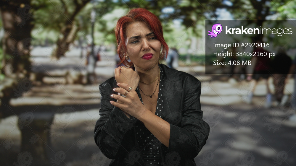 Young hispanic woman holding her wrist on a sunlit park walkway, wearing rings and layered necklaces, pained grimace; pain concern.