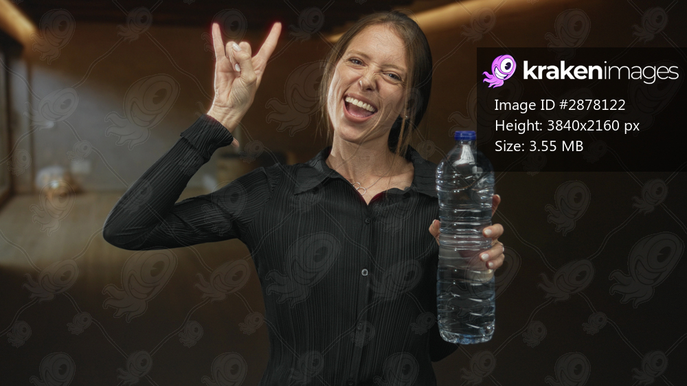 Young hispanic woman holding large water bottle making rock horns gesture in studio; joy celebration.